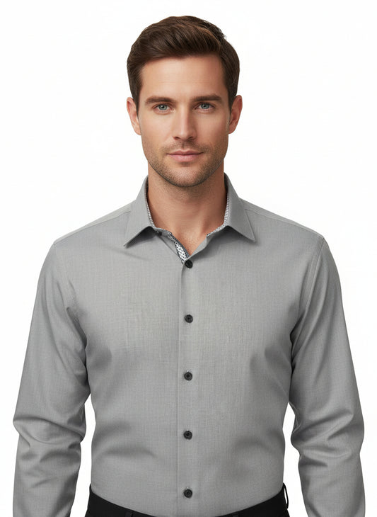 GREY MICRO TWILL DRESS SHIRT WITH CONTRASTING BUTTONS, COLLAR AND CUFF