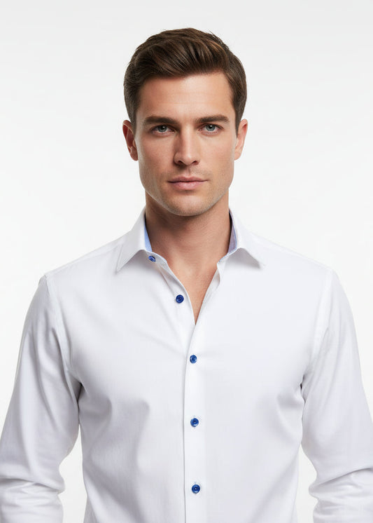 WHITE DRESS SHIRT WITH CONTRASTING BUTTONS, COLLAR AND CUFF