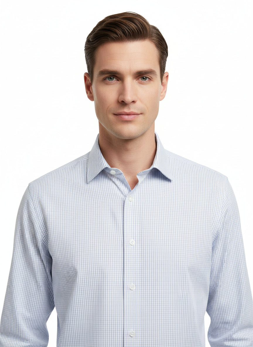 This versatile light blue checkered long sleeve shirt men's is the perfect pairing to any outfit, beit jeans or a suit. It’s made with a 100s 2-ply Egyptian cotton twill construction that gives it the perfect balance of durability, smoothness, and gentle drape. Our signature modified spread collar complements formal and casual looks. The modified cuff can be buttoned up or worn with a cufflink. This is the perfect shirt to wear from work-week into the weekend!